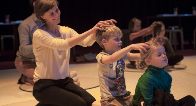 Dans mee met Judith Clijsters en Passerelle of geniet van een deugddoende massage bij Katrien Oosterlinck. In ‘Massage-collage’ installeren jong en oud zich per twee op een rustig eilandje in de ruimte. Een adempauze in de drukte. Begeleid door een gids die de bewegingen voordoet, geven ouders en kinderen elkaar een korte massage. Warm licht, maffe geluiden en zachte kussens zorgen voor de sfeer. Wat heb je gevoeld in je lichaam? Je hoeft het niet te verwoorden, het mag met stickers op kalkpapier.