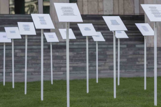Wiesner’s project genaamd “28”, volgens het aantal staten van de Europese Unie. Een eenvoudige installatie die met zijn geometrische raster lijkt op een moderne militaire begraafplaats, presenteert zonder enige bijschriften de tekst van alle 28 hymnes van EU-landen, allemaal vertaald in het Nederlands en Frans.